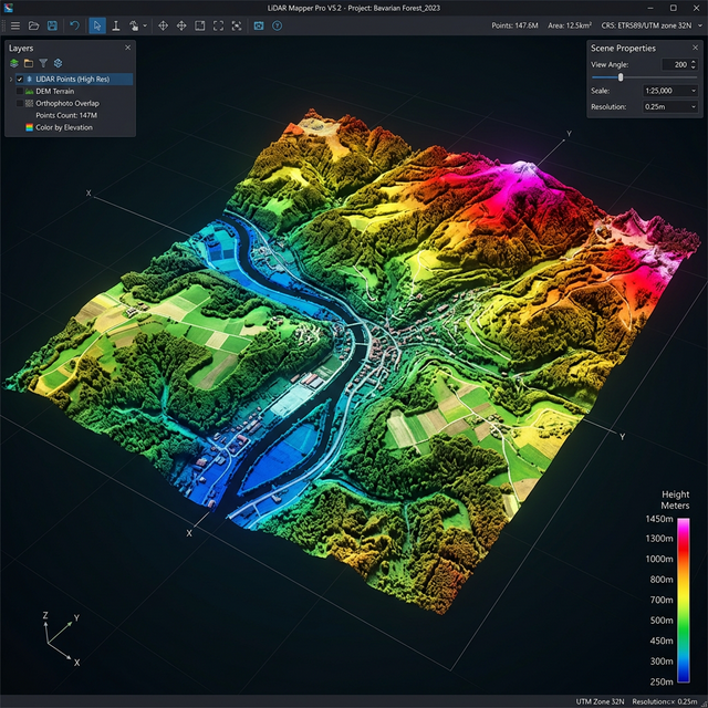 Typische LiDAR Maps Germany haben eine Punktdichte von 4–25 Punkten pro Quadratmeter und eine vertikale Genauigkeit von ±5–15 cm. Das ist 100x genauer als Standard-Satellitenbilder.